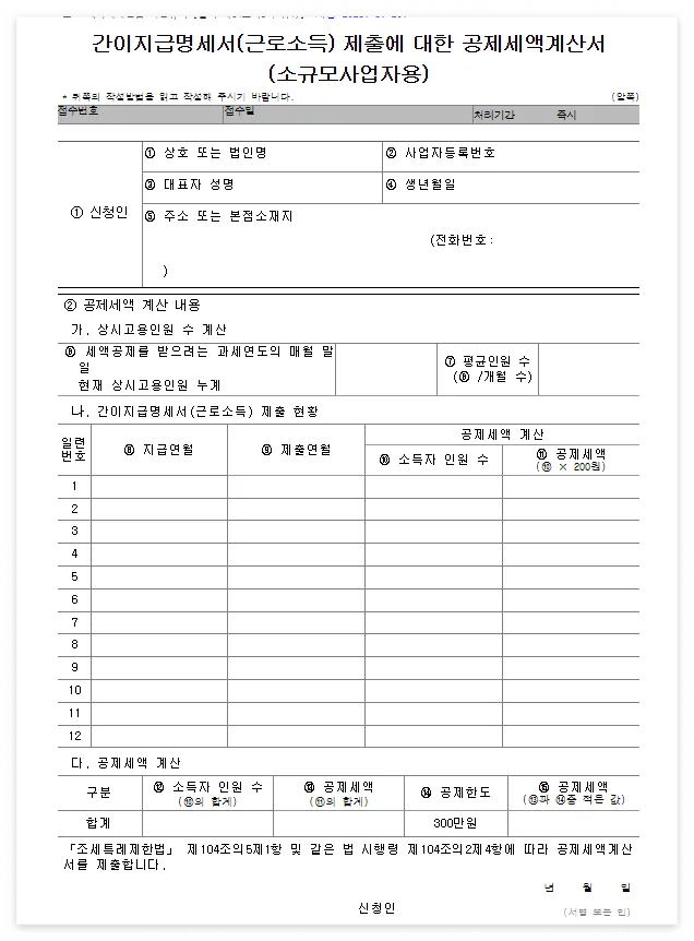 | 대상 서식 | [조세특례제한법 시행규칙 별지 제64호의8서식(1)] 소규모사업자용 |