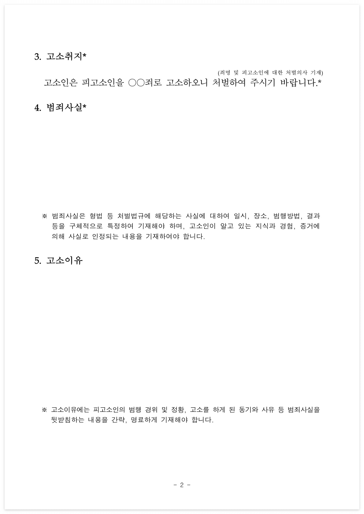 | 고소취지 및 범죄사실 | 처벌을 원하는 죄명, 범죄 일시, 장소, 방법, 결과 구체적 기재 |